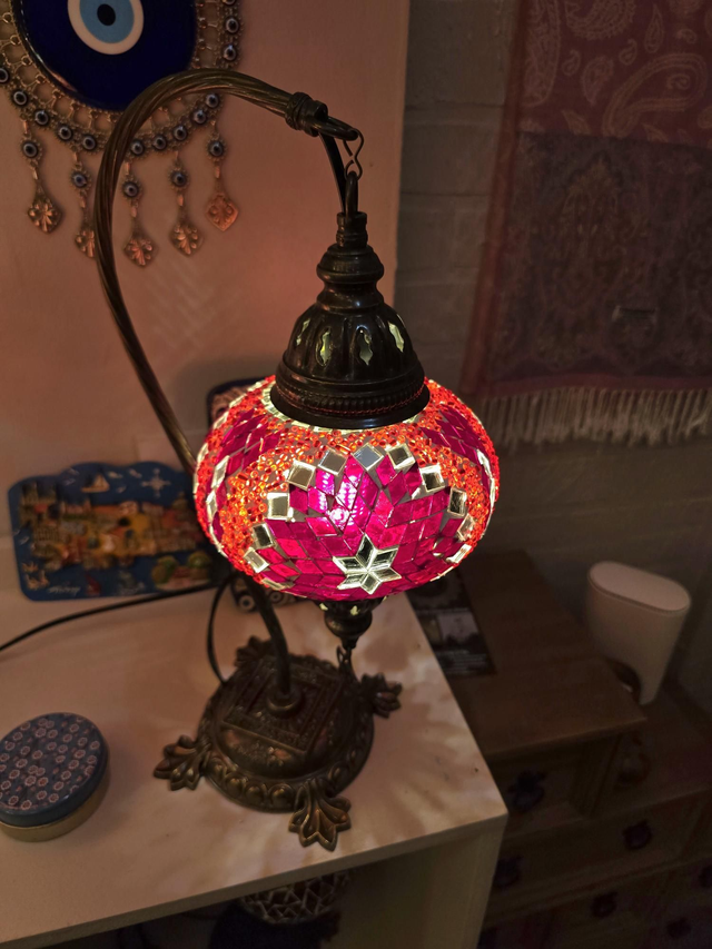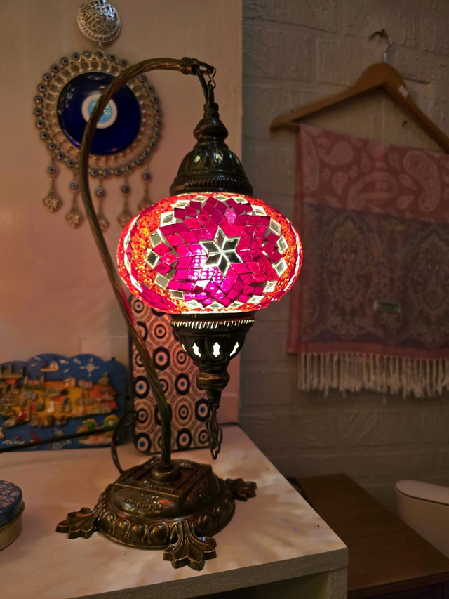 - Red shade with bras colored swanneck stand.