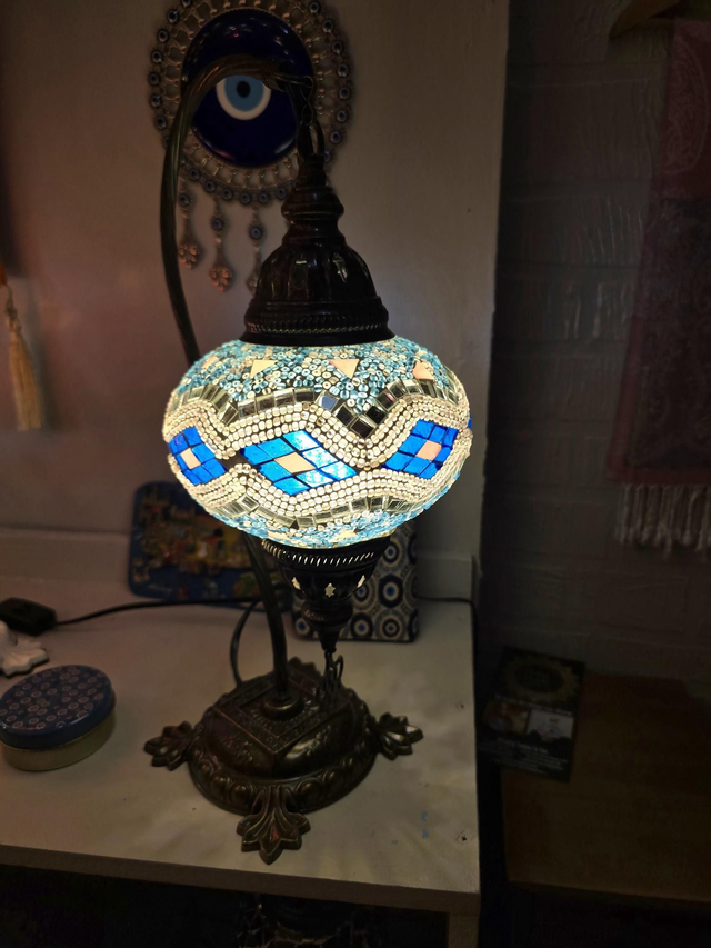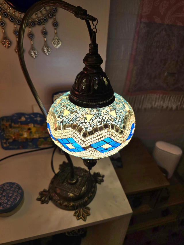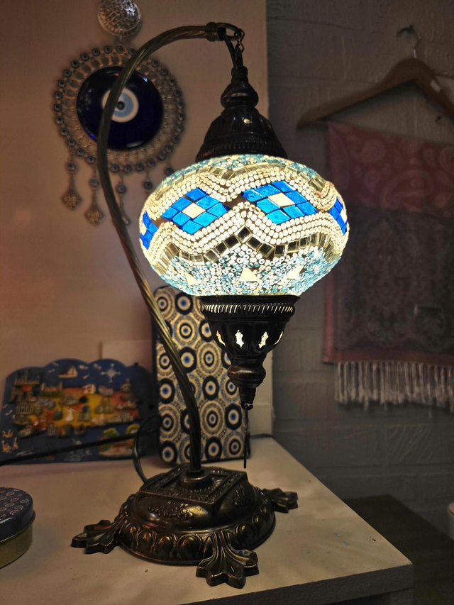 - Hand-blown solid glass mosaic globe has a 6" diameter.