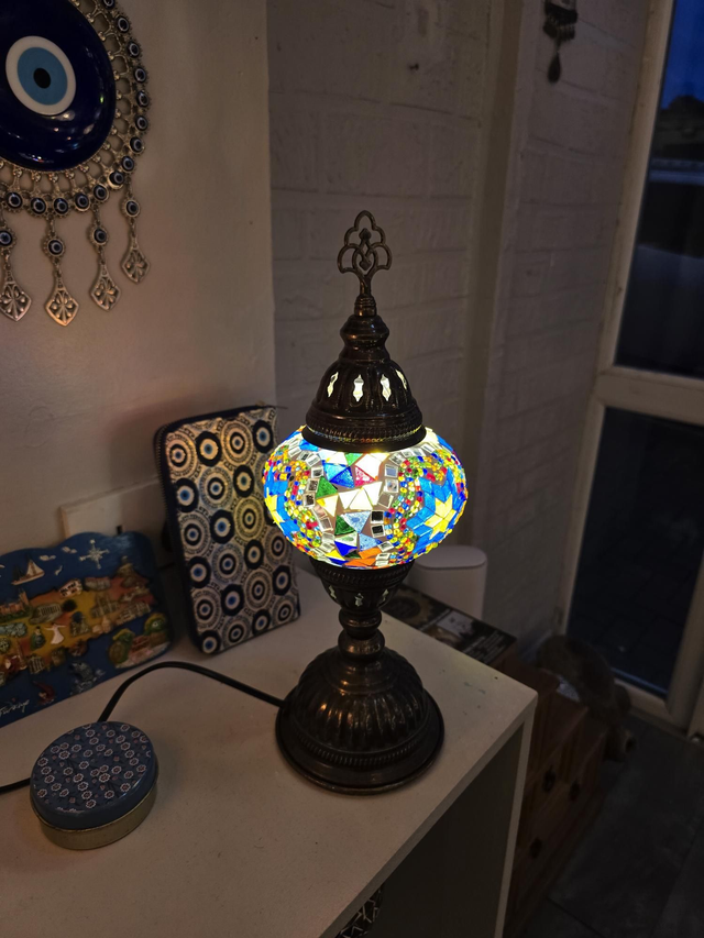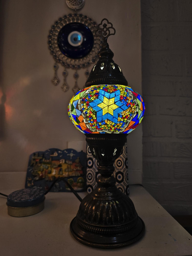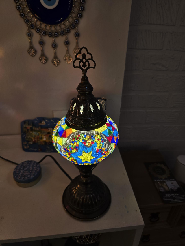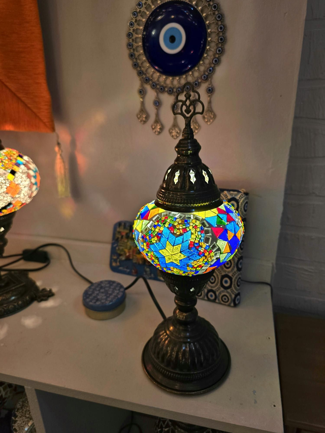 - Multicolored shade with bras colored stand.