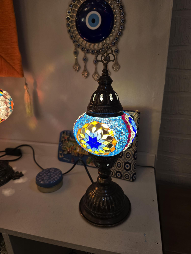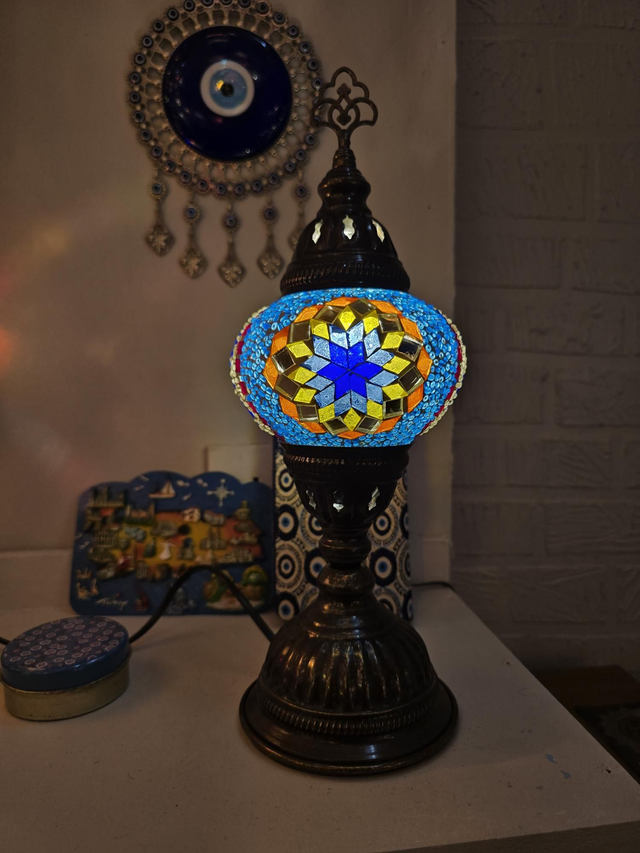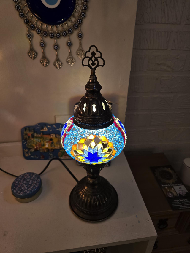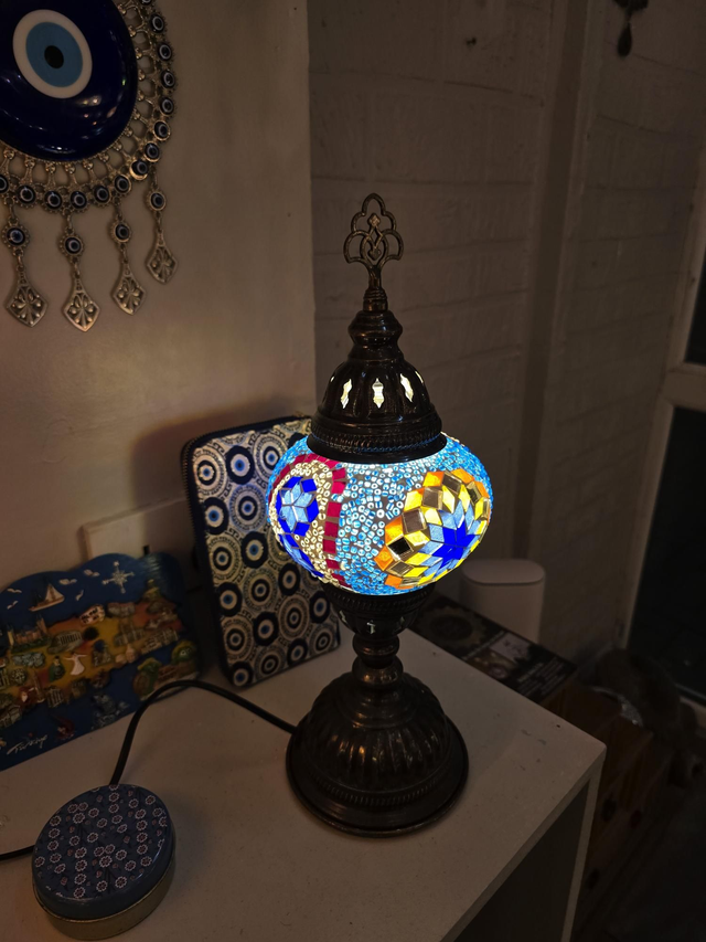 - Multicolored shade with bras colored stand.