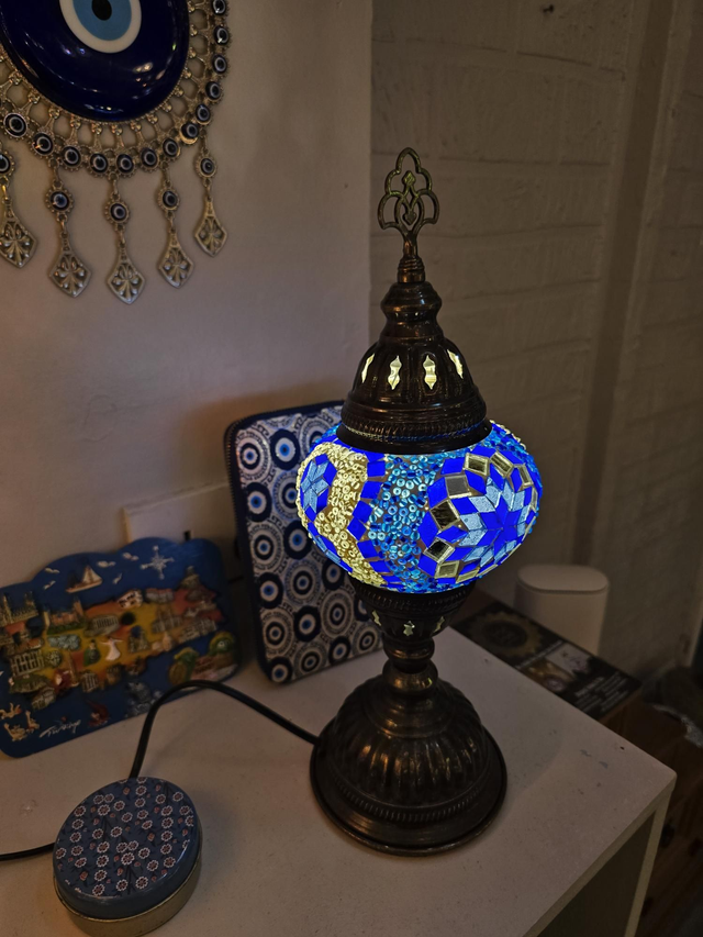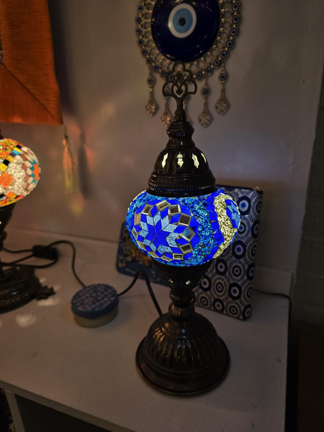 - Hand-blown solid glass mosaic globe has a 5" diameter.