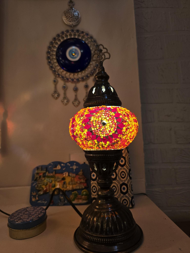 - Hand-blown solid glass mosaic globe has a 5" diameter.