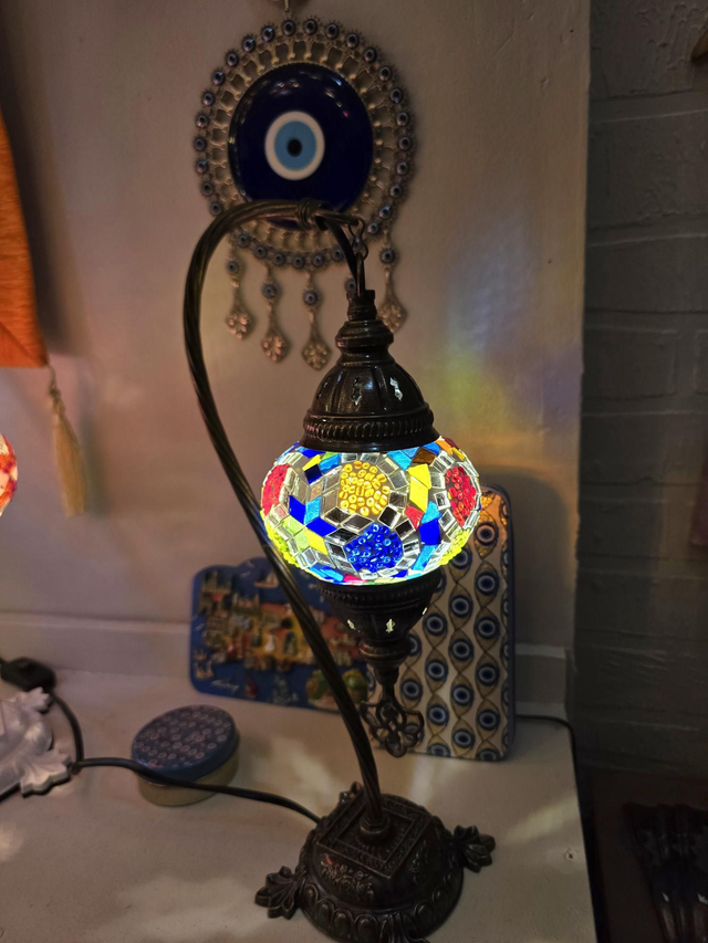 - Hand-blown solid glass mosaic globe has a 4" diameter.