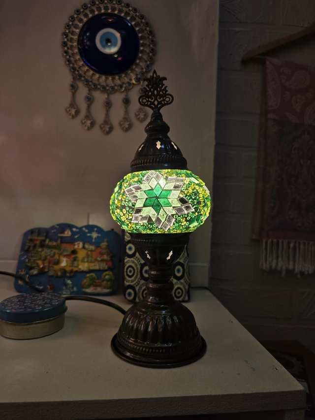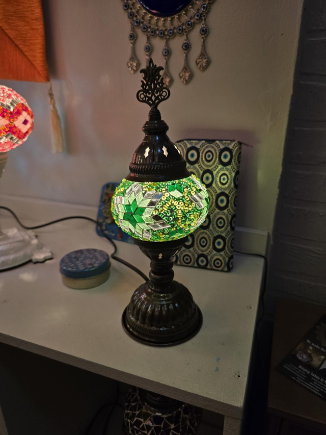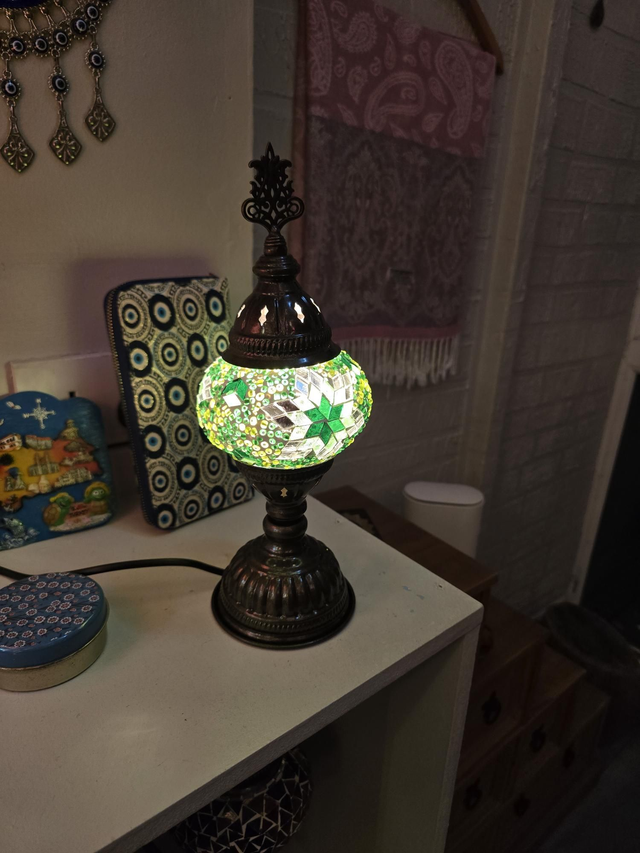 - Hand-blown solid glass mosaic globe has a 4" diameter.