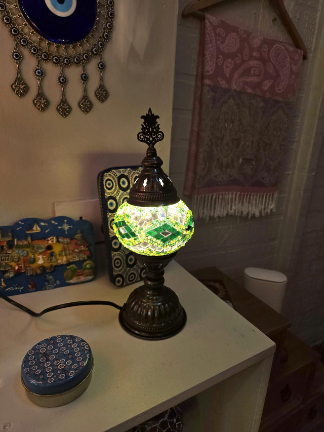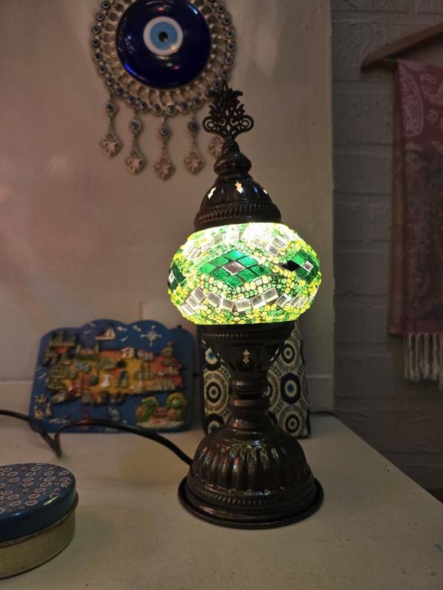 - Hand-blown solid glass mosaic globe has a 4" diameter.